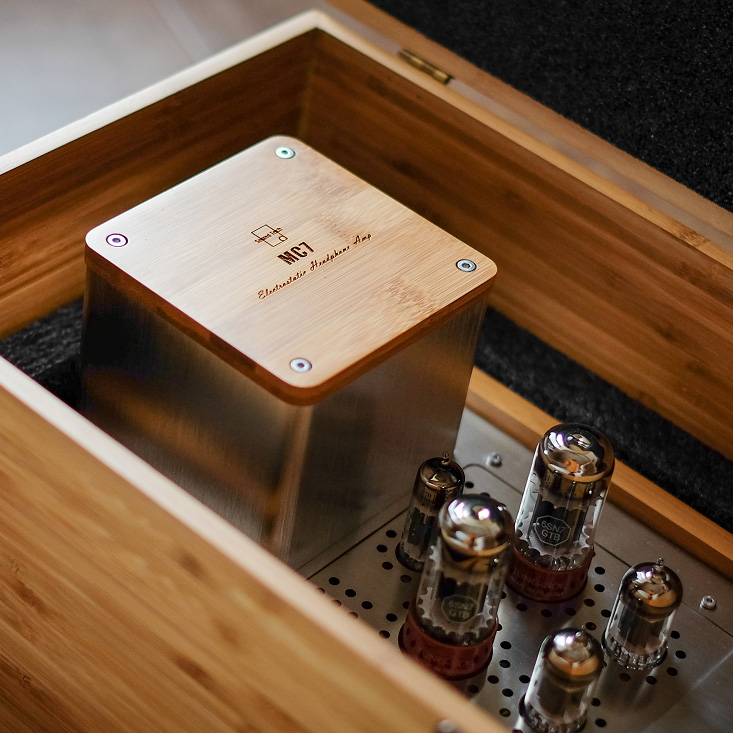 MC9是SoundTech和KS合作推出的,在KS H04的基础上改良了振膜和耳罩等的声学部分,声音更为平衡细腻,而MC7耳放,更是专门为MC9设计的套装,SoundTech声技 MC7静电耳极放大器,采用全平衡电子管放大,无论是驱动力以及音色都非常出色。